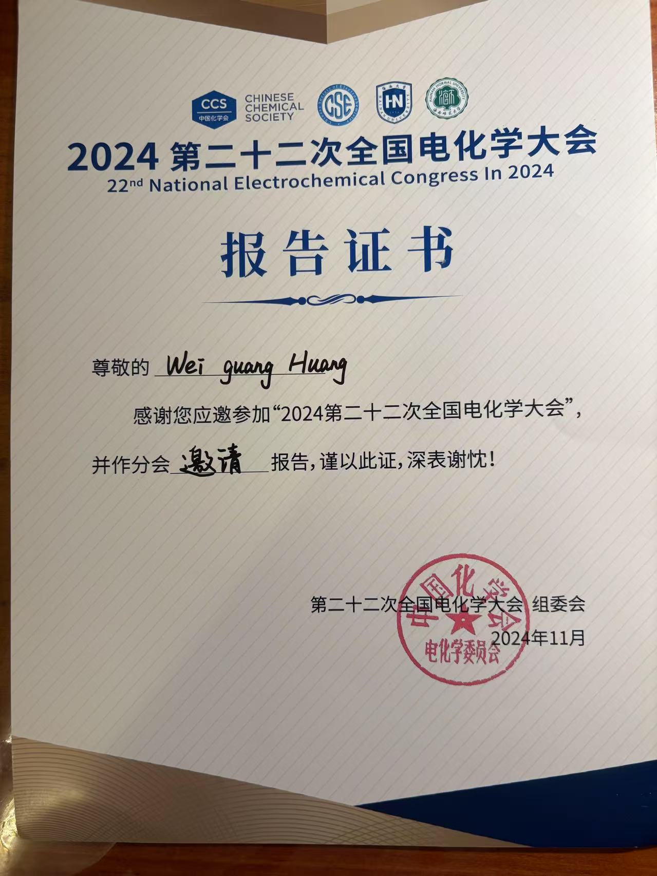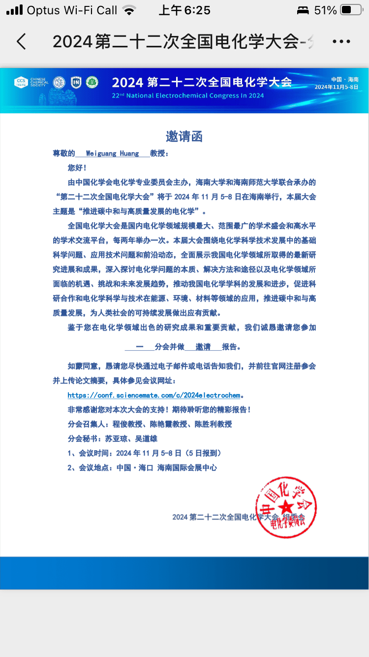 电化学大会邀请报告 invitation in electrochemistry meeting