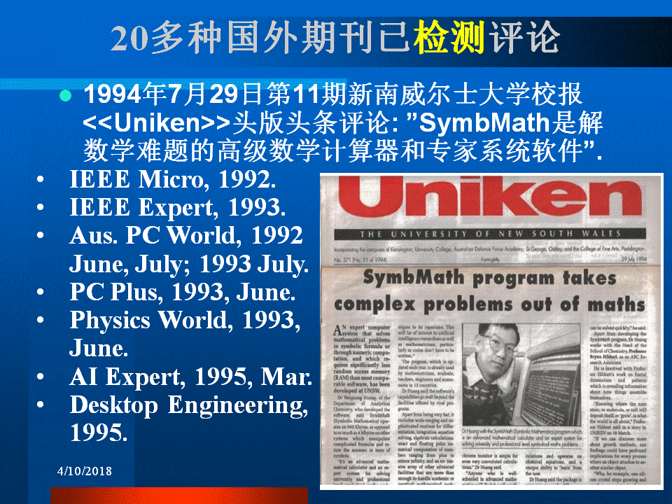 20多种国际期刊已检测评论我的软件, 例如:1994年7月29日第11期