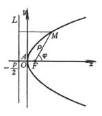 (极坐标方程,极点位于焦点F上,极轴与抛物线的轴重合,背向顶点) |