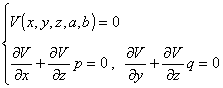 ,这时,如果不属于情形2° ,则a与b存在函数关系:b=(a),这里为任意可微函数,并从方程V(x,y,z,a,b)=0和