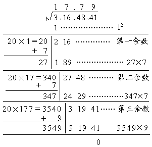 第一步,先将被开方的数,从小数点位置向左右每隔两位用逗号分段,如把数316.4841分段成3,16.48,41.第二步,找出第一段数字的初商,使初商的平方不超过第一段数字,而初商加1的平方则大于第一段数字,本例中第一段数字为3,初商为1,因为12=1<3,而(1+1)2=4>3.第三步,用第一段数字减去初商的平方,并移下第二段数字,组成第一余数,在本例中第一余数为216.第四步,找出试商,使(20´初商+试商)´试商不超过第一余数,而[20´初商+(试商+1)]´(试商+1)则大于第一余数.第五步,把第一余数减去(20´初商+试商)´试商,并移下第三段数字,组成第二余数,本例中试商为7,第二余数为2748.依此法继续做下去,直到移完所有的段数,若最后余数为零,则开方运算告结束.若余数永远不为零,则只能取某一精度的近似值.第六步,定小数点位置,平方根小数点位置应与被开方数的小数点位置对齐.本例的算式如下: